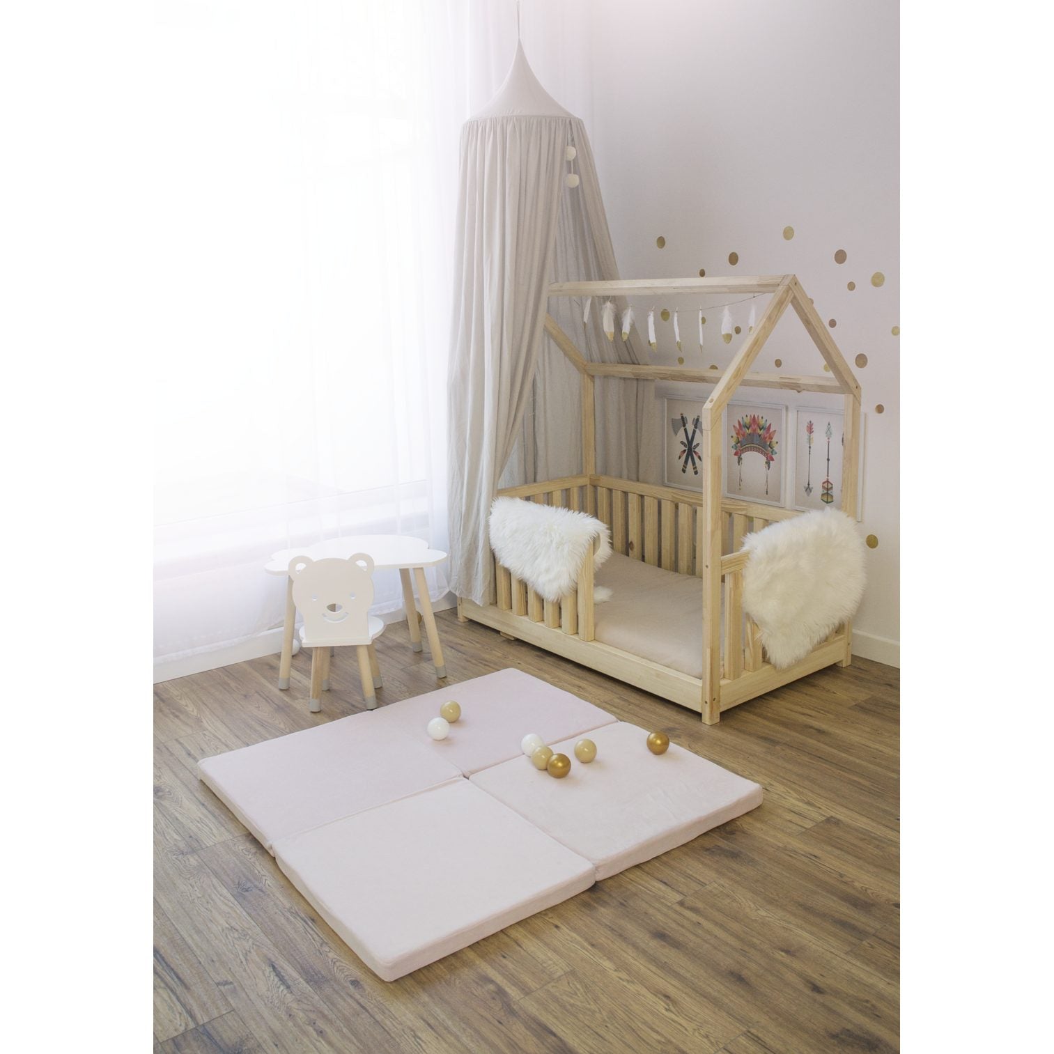 There are more applications for the child mat, which is its main advantage. The mat we present in our shop will be perfect as a carpet, it may be placed under the teepee tent or the canopy as well as it may constitute an integral part of the MeowBaby ball pit. Soft mat placed under the ball pit will not only look great but also will cushion the fall of the toddler and will isolate him from the cold floor. Placed in the garden, on the terrace or on the beach will create a comfortable place for playing and rest.